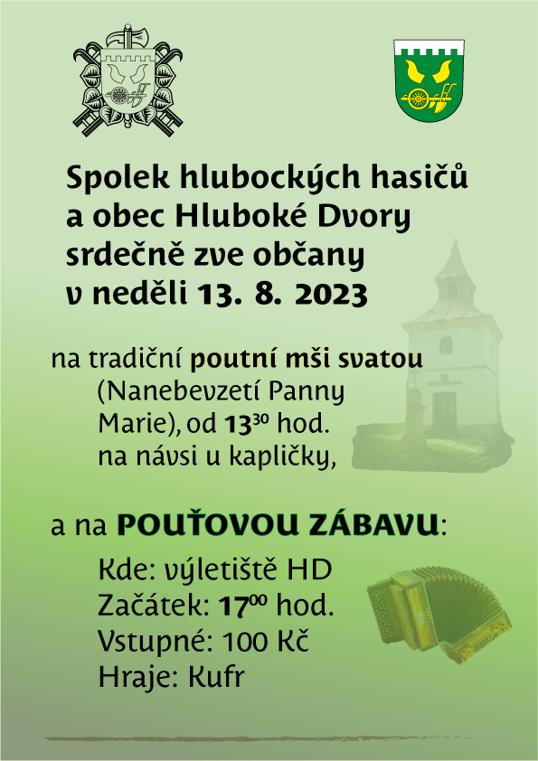 Úvod > Aktuality > Pozvánka na poutní mši a pouťovou zábavu v Hlubokých Dvorech 13. 8. 2023