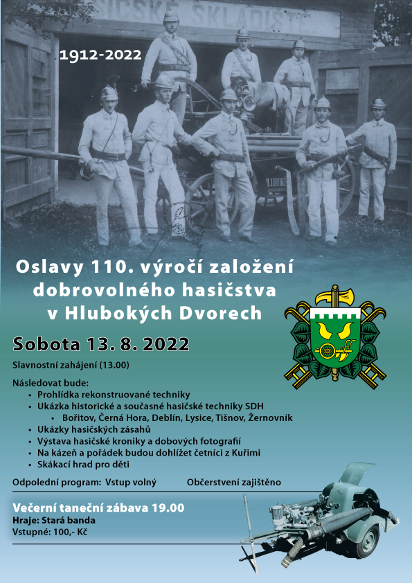 Pozvánka na oslavy 110. výročí založení hasičstva v Hlubokých Dvorech a na taneční pouťovou zábavu [pdf]
