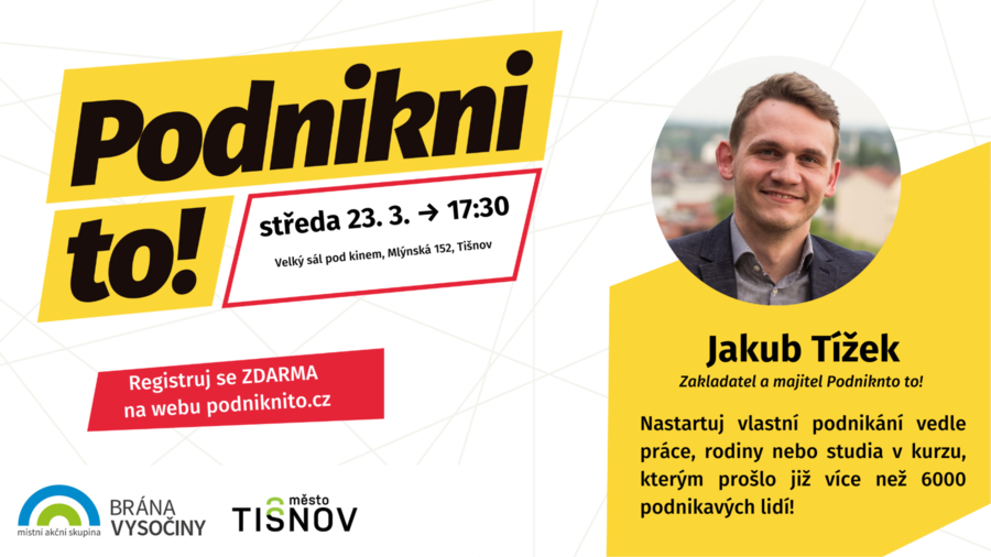 Skládá se z 5 setkání, která budou probíhat jednou týdně vždy v úterý. První workshop odstartuje v úterý 22. března 2022 v 17:30 ve Velkém sále MěKS, Mlýnská 152. Účast je díky podpoře MAS Brána Vysočiny zdarma. Zájemci se můžou přihlásit na webu podniknito.cz na podstránce s názvem Podnikni to! v Tišnově nebo jednoduše napsat na e-mail platenikova@podniknito.cz.