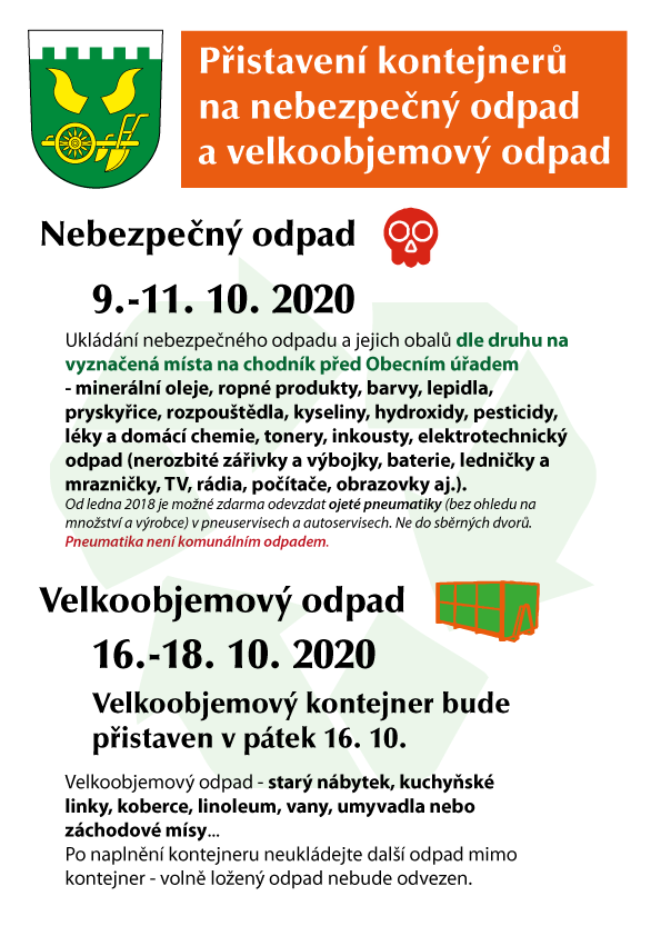 OÚ oznamuje občanům, že budou přistaveny kontejnery na nebezpečný odpad (9.-11. 10.) a velkoobjemový odpad (16.-18. 10.).