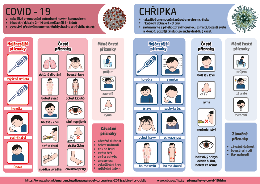 protože nastává období častých virových respiračních onemocnění, dovoluji si přidat informace, které vám pomohou odlišit příznaky chřipky od příznaků onemocnění covid-19 a několik informací, jak se chovat, co dělat, abychom se nenakazili.