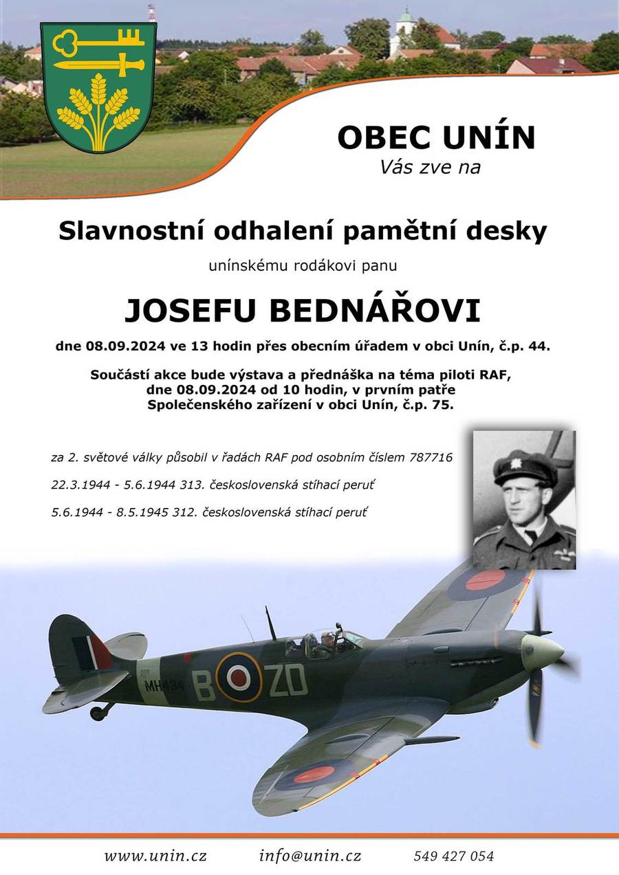 Pozvánka na odhalení pamětní desky rodákovi Unína panu Josefu Bednářovi