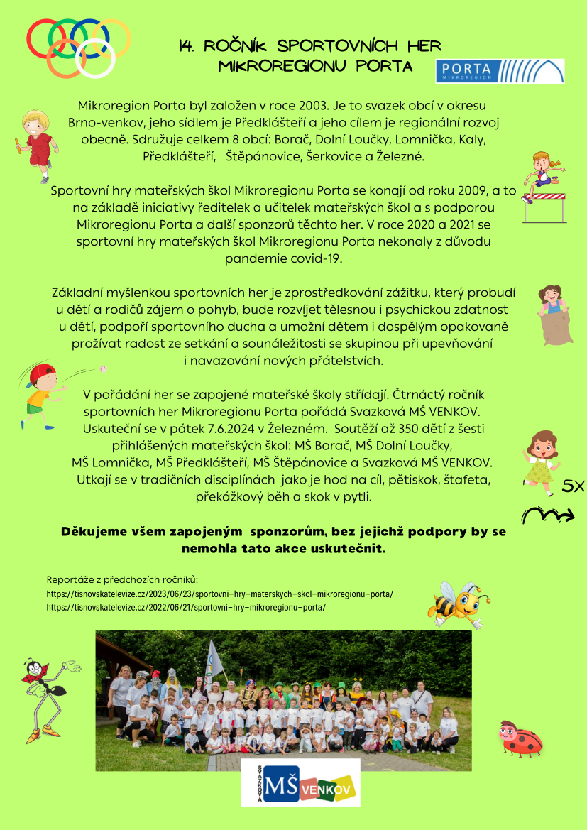 naše svazková MŠ VENKOV pořádá v pátek 7.6.2024 v dopoledních hodinách Sportovní hry pro 350 dětí z okolních MŠ.